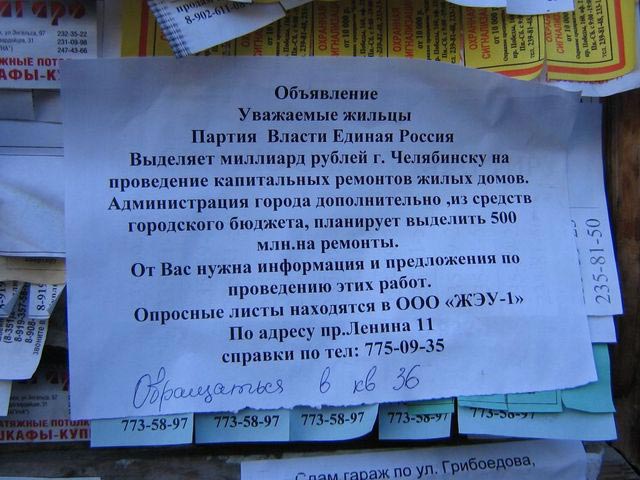 Доминирование в публичном пространстве - это не только вопрос денег. При этом "Единая Россия" задействует и институциональный ресурс, ведь получить место и разместить билборды в Москве можно только с санкции администрации. Партия власти не гнушается использовать в своих целях образовательные учреждения, хотя законом это категорически запрещено. Во многих городах производилась раздача первоклашкам памяток с символикой "Единой России", а студентам вузов перчаток с эмблемой партии. В медицинских учреждениях появились халаты с "медведем" и агитаторы, склоняющие врачей к вступлению в ряды ЕР. Единороссы ставят себе в заслугу выполнение обычных должностных обязанностей, в том числе выделение бюджетных средств на различные социальные программы, например, на ремонт дорог и так далее. В Челябинске служба единого заказчика, где даже имеется отдел избирательных технологий, вывесила объявление, что "Единая Россия" выделила средства на капитальный ремонт жилых домов в размере 1 миллиарда рублей. Откуда деньги опять же?