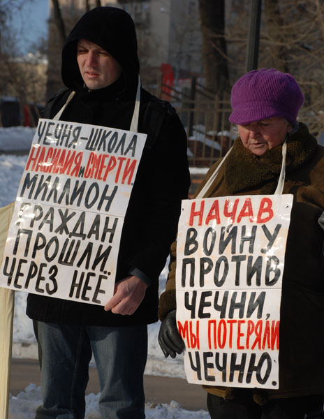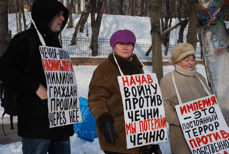 В память о погибших участники пикета принесли с собой цветы. Они держали в руках плакаты, осуждающие насилие и террор и, в частности, войну в Чечне.
