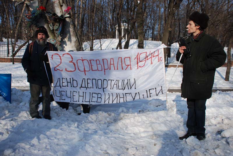 Она была приурочена к февральским событиям 1944 года, когда тысячи чеченцев и ингушей были высланы в Казахстан. Как отметили участники акции, депортация унесла жизни тридцати - шестидесяти процентов представителей этих народов. Пикетчики выразили сожаление, что эти трагические события сегодня забыты, и 23 февраля воспринимается большинством исключительно как праздник.